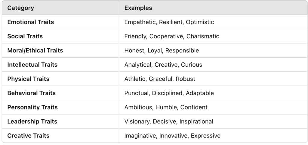 Here’s what I will cover in this post: first, a definition of character traits. Next, I will discuss the importance of character traits,then, I will provide examples of character traits across several categories, including emotional, social, moral/ethical, intellectual, physical, behavioral, personality, leadership, and creative traits.